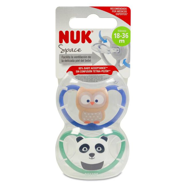 Nuk Space Chupete de Silicona 18-36 meses es un chupete con divertidos dibujos para los bebés de los 18 a los 36 meses de edad.