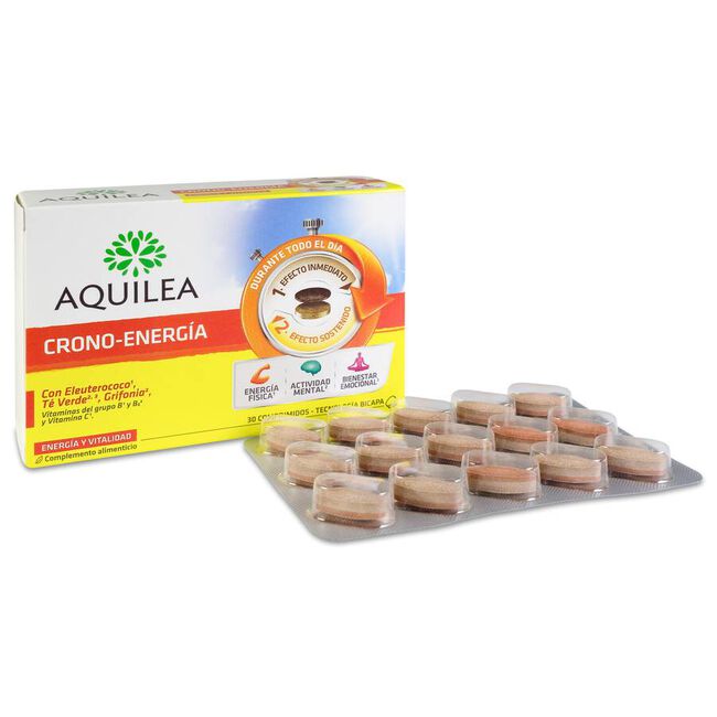 Aquilea Crono-Energía es un complemento alimenticio elaborado con extractos naturales y vitaminas del grupo B (B1, B2, B3, B5, B6, B8, B9, B12) y C. Está especialmente diseñado para aumentar los niveles de energía necesarios para sobrellevar los días más exigentes.