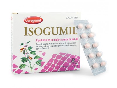 Ceregumil Isogumi es un complemento alimenticio a base de soja, aceite de onagra y vitamina E que ayuda a prevenir los síntomas de la menopausia y mantener una vida sana. Gracias a los numerosos beneficios que aportan las isoflavonas de soja, ayuda a reducir los sofocos, calores nocturnos, irritabilidad, ansiedad, etc. Además, también mejora la estructura ósea, disminuye el riesgo cardiovascular y es un potente antioxidante.