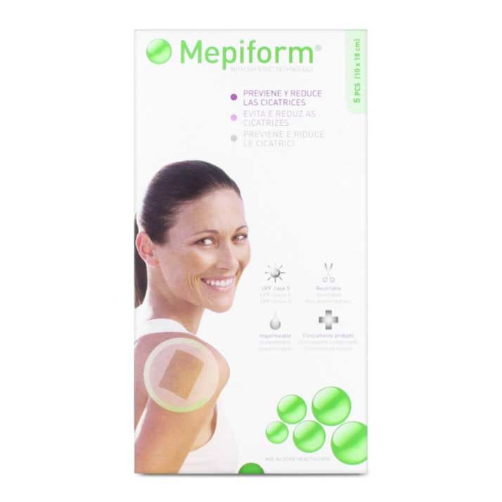Mepiform 10x18 cm 5 unidades es un vendaje de silicona autoadhesivo que se utiliza para el tratamiento de cicatrices. Está hecho de una lámina fina y flexible de poliuretano con una capa de gel de silicona adhesiva en la parte inferior. El gel de silicona es delicada y no irritante para la piel, y ayuda a hidratar la zona de la cicatriz mientras se reduce la tensión en la piel.