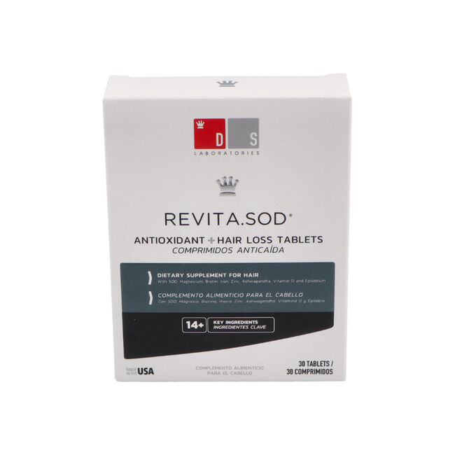 DS Revita.Sod es un producto presentado en formato de 30 comprimidos y que tiene como principal propósito evitar la pérdida del cabello que suele producirse por el estrés intenso y duradero. Se define como un nutracéutico y, por tanto, es capaz de estimular el crecimiento del cabello y contrarrestar las consecuencias en el organismo del estrés y del daño oxidativo. Su formulación incluye superóxido, dismutasa y ashwagandha, que son unos potentes antioxidantes. Coadyuvan a contener el efecto de los radicales libres y de los factores medioambientales en el organismo.