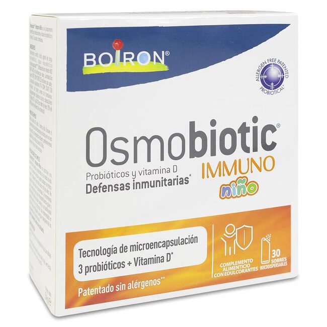 Boiron Osmobiotic Inmuno Niño se caracteriza por reunir en un mismo lugar todo lo necesario para reforzar el sistema inmunitario. Gracias a su fórmula ideada con probióticos, es capaz de mantener una microbiota saludable. De igual forma, su fórmula se encuentra enriquecida con vitamina D que contribuye al funcionamiento normal del sistema inmunitario. De manera que una de las funciones principales de Osmobiotic es aumentar las plaquetas y reforzar las defensas de los niños, para brindarles una protección extra ante la presencia de algún agente viral o infeccioso.