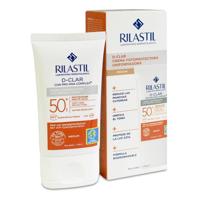 Rilastil Sun System D-Clar Crema Medium SPF50+. Se trata de una crema con protección contra los efectos dañinos del sol. Tiene una textura muy suave y está formulada con la tecnología Clari Tech Complex.