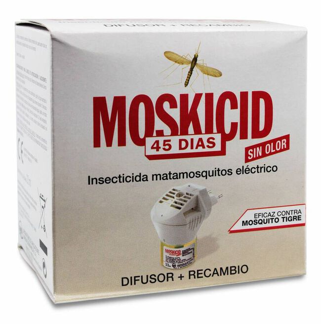 Moskicid es un difusor eléctrico que actúa frente a los mosquitos, siendo eficaz frente al mosquito Tigre. Su eficacia se mantiene durante 45 días, proporcionando protección a toda la estancia sin liberar olores al ambiente. Solo hay que conectar el difusor a la red eléctrica y olvidarse de los mosquitos.